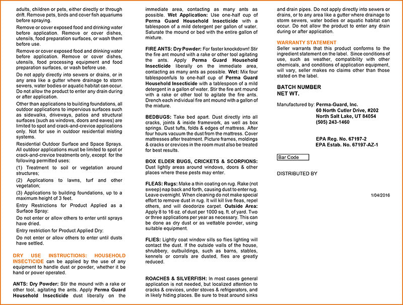 For control of roaches, silverfish, ants, bedbugs, flies, fleas, box elder bugs, scorpions, crickets, and many others! Perma-Guard Household Insecticide products are licensed to be used in and around the home, yard, animal housing, etc.